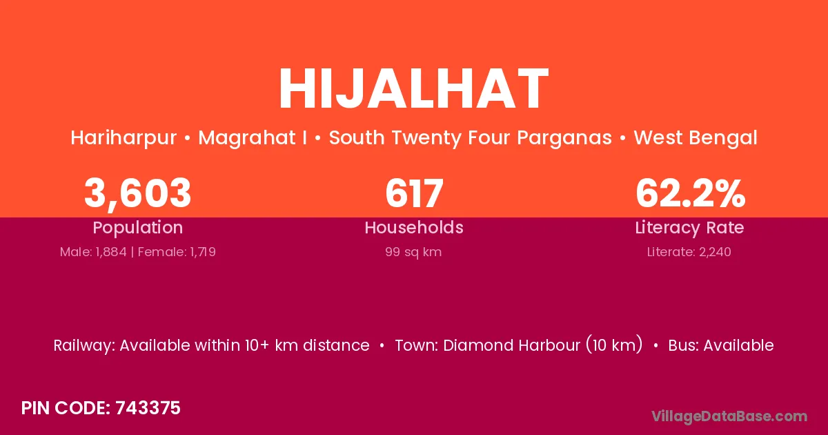 Diamond Harbour (10 km) is the nearest town to Hijalhat village for major economic activities and is located approximately 10 km away.