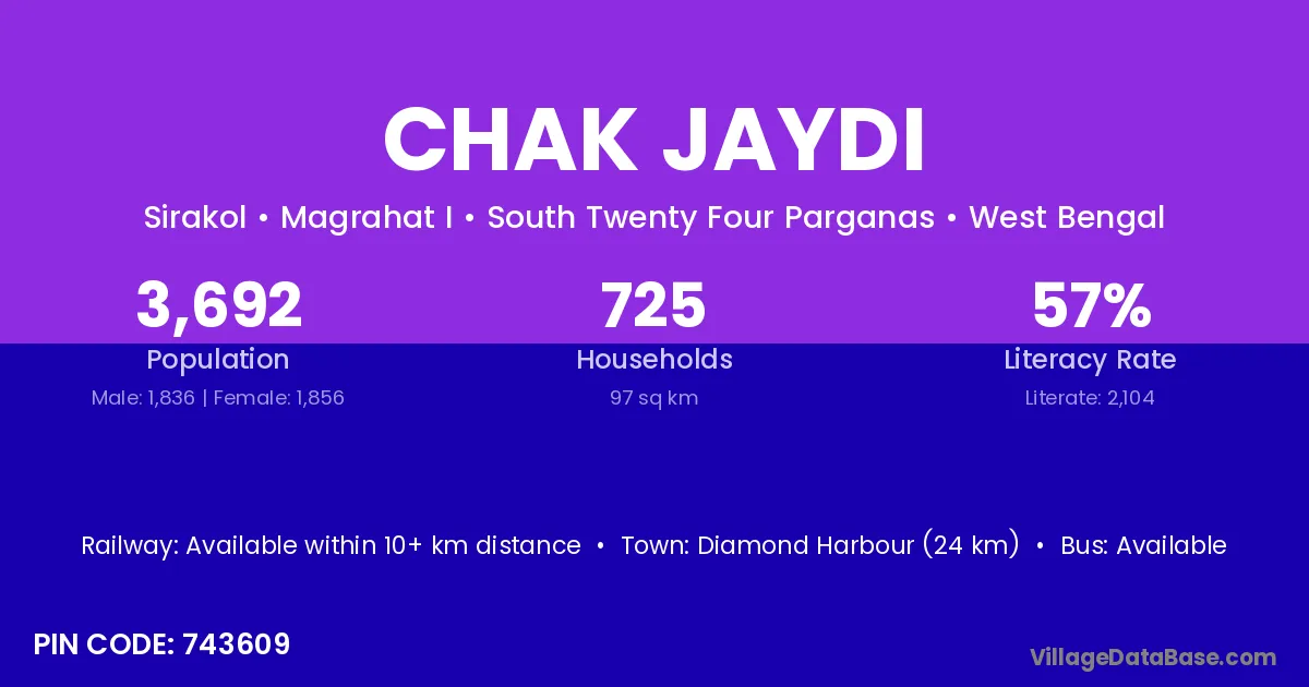 Diamond Harbour (24 km) is the nearest town to Chak Jaydi village for major economic activities and is located approximately 24 km away.