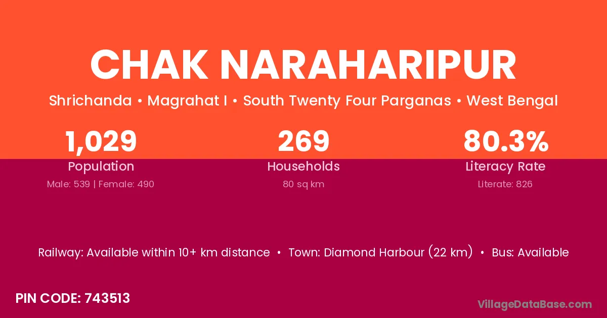 Diamond Harbour (22 km) is the nearest town to Chak Naraharipur village for major economic activities and is located approximately 22 km away.