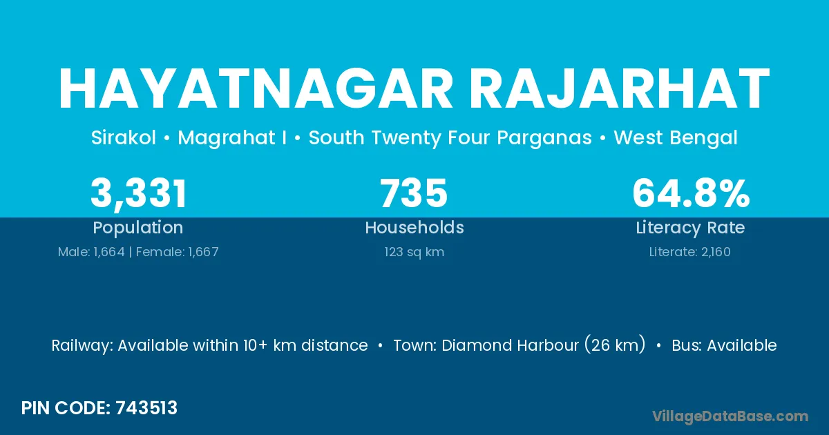 Diamond Harbour (26 km) is the nearest town to Hayatnagar Rajarhat village for major economic activities and is located approximately 26 km away.