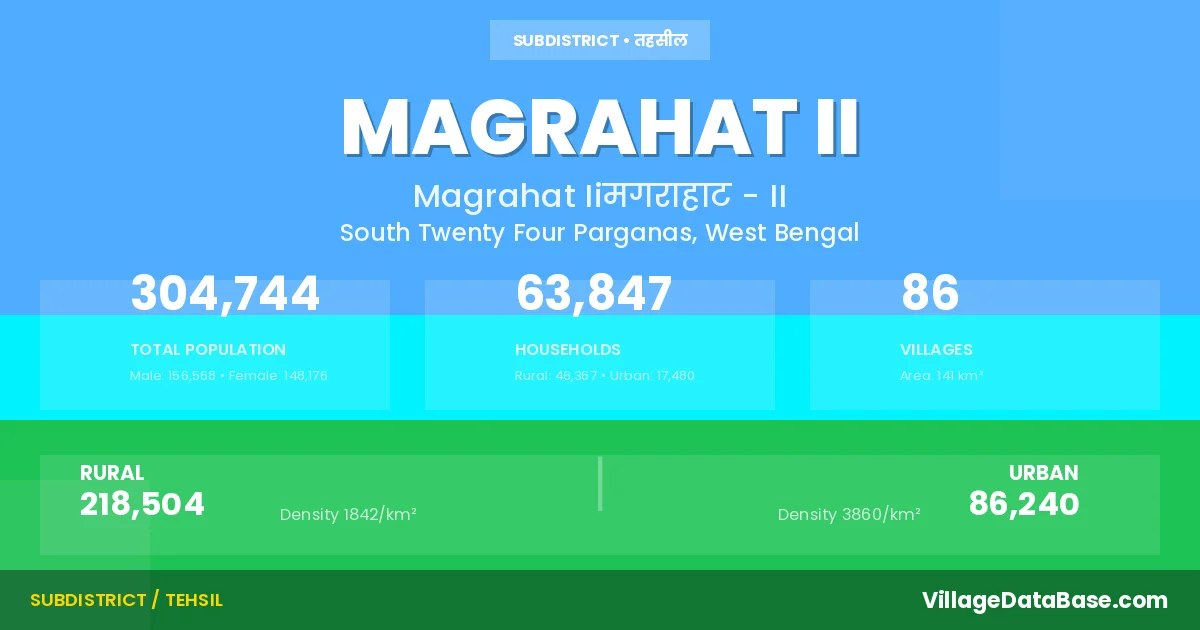 According to the 2011 census The total area of Magrahat II Subdivision is 141 km², with a population of 304744 people. The population density is 2,162 inhabitants per square kilometre, and there are approximately 63847 houses in the sub district.