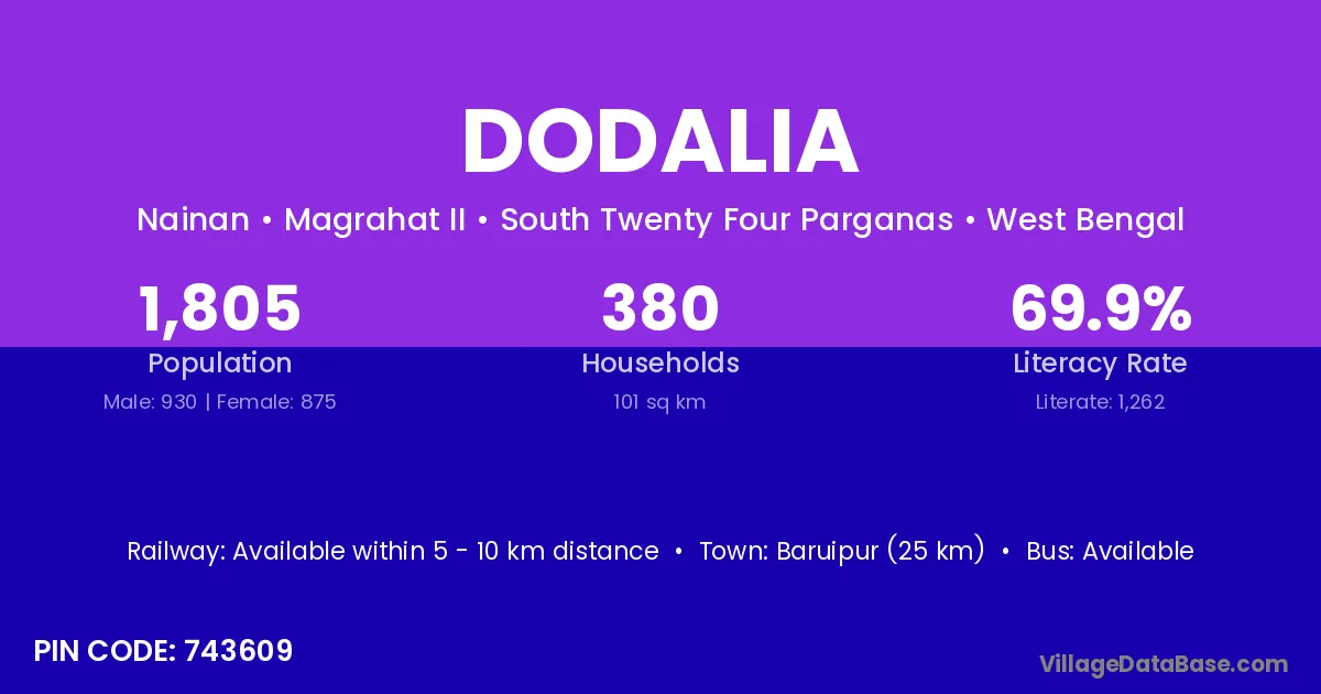 Baruipur (25 km) is the nearest town to Dodalia village for major economic activities and is located approximately 25 km away.