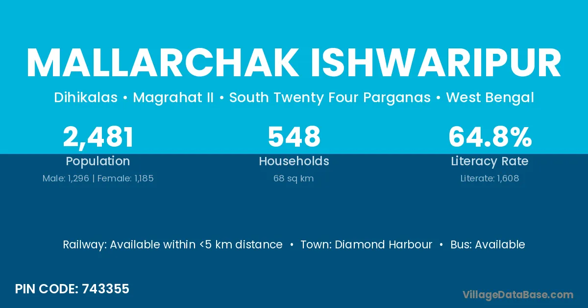 Mallarchak Ishwaripur village is located in the Magrahat II Subdivision of the South Twenty Four Parganas district in West Bengal.