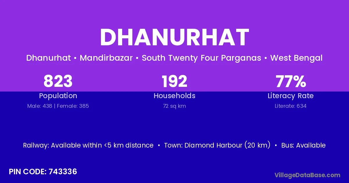 Diamond Harbour (20 km) is the nearest town to Dhanurhat village for major economic activities and is located approximately 20 km away.