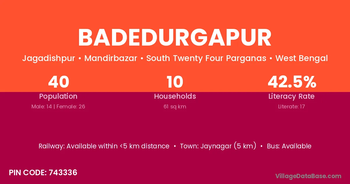 Badedurgapur village is located in the Mandirbazar Subdivision of the South Twenty Four Parganas district in West Bengal.
