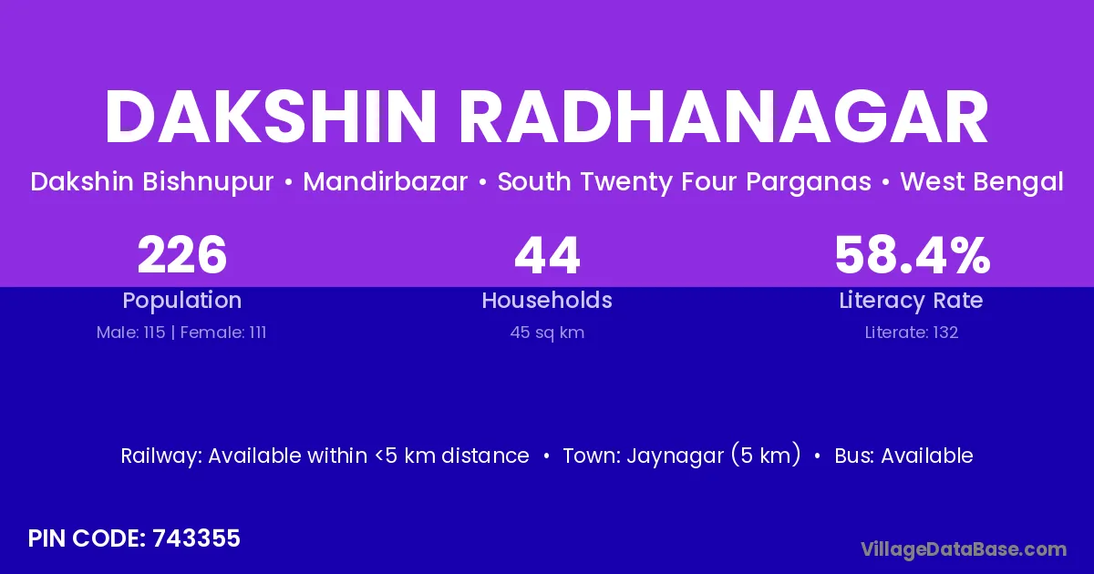 Dakshin Radhanagar village has a total population of 226 people, of which 115 are males and 111 are females.