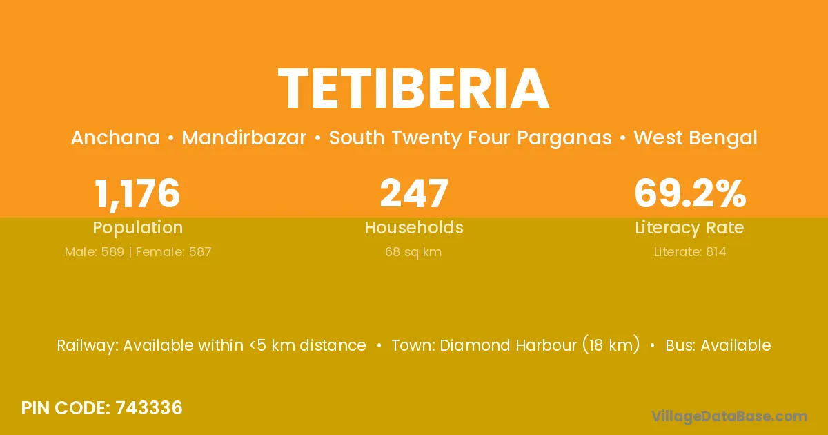 Diamond Harbour (18 km) is the nearest town to Tetiberia village for major economic activities and is located approximately 18 km away.