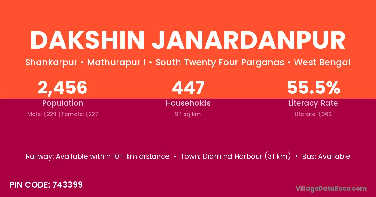 Diamind Harbour (31 km) is the nearest town to Dakshin Janardanpur village for major economic activities and is located approximately 31 km away.
