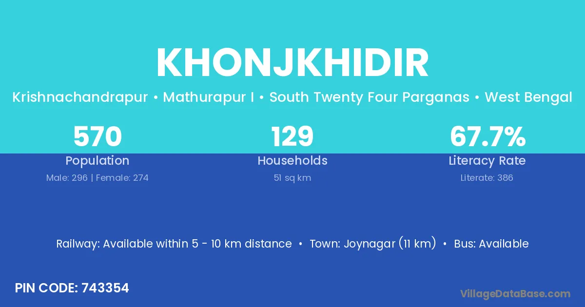 Joynagar (11 km) is the nearest town to Khonjkhidir village for major economic activities and is located approximately 11 km away.