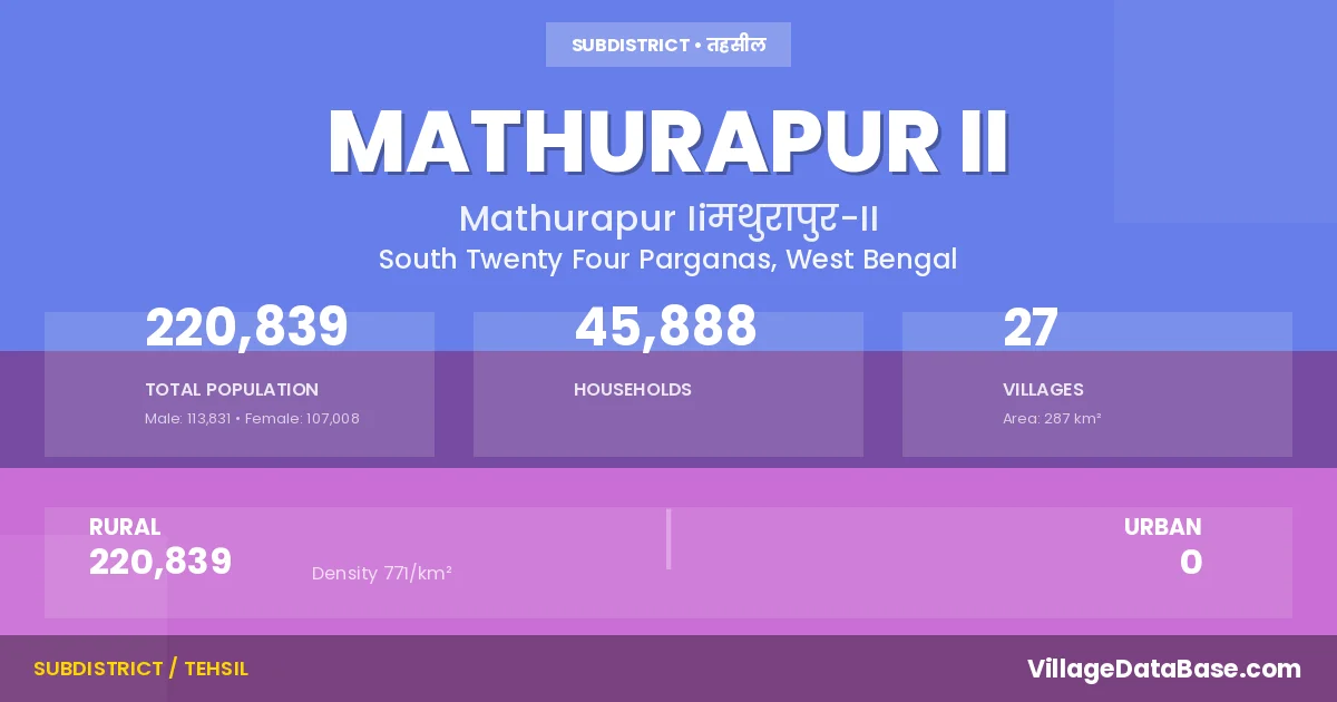According to the 2011 census The total area of Mathurapur II Subdivision is 287 km², with a population of 220839 people. The population density is 771 inhabitants per square kilometre, and there are approximately 45888 houses in the sub district.