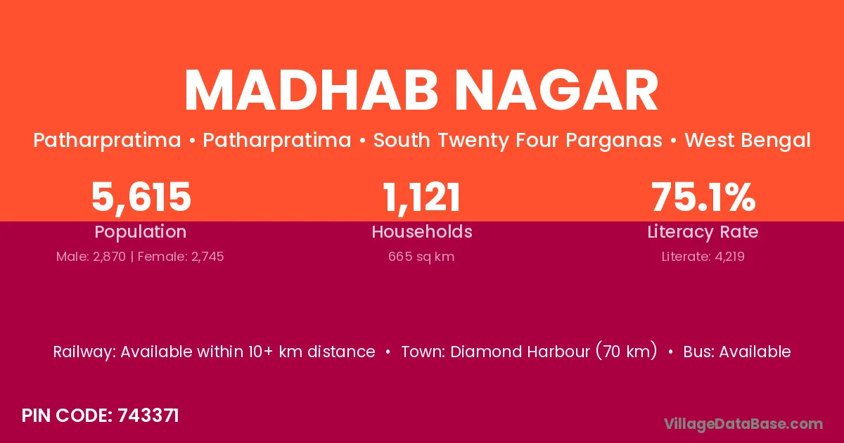 Diamond Harbour (70 km) is the nearest town to Madhab Nagar village for major economic activities and is located approximately 70 km away.