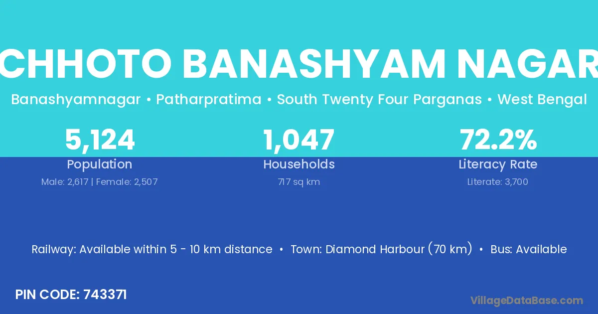 Diamond Harbour (70 km) is the nearest town to Chhoto Banashyam Nagar village for major economic activities and is located approximately 70 km away.