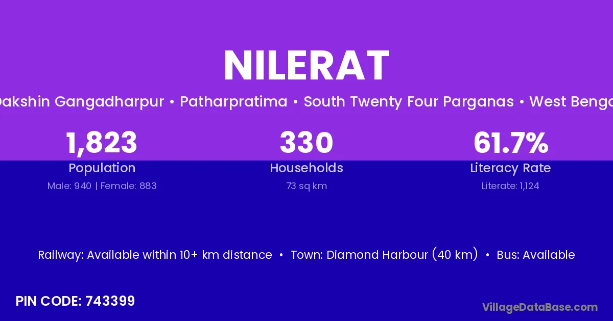 Diamond Harbour (40 km) is the nearest town to Nilerat village for major economic activities and is located approximately 40 km away.