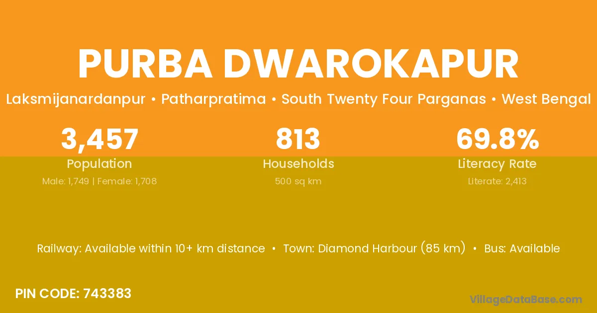 Diamond Harbour (85 km) is the nearest town to Purba Dwarokapur village for major economic activities and is located approximately 85 km away.