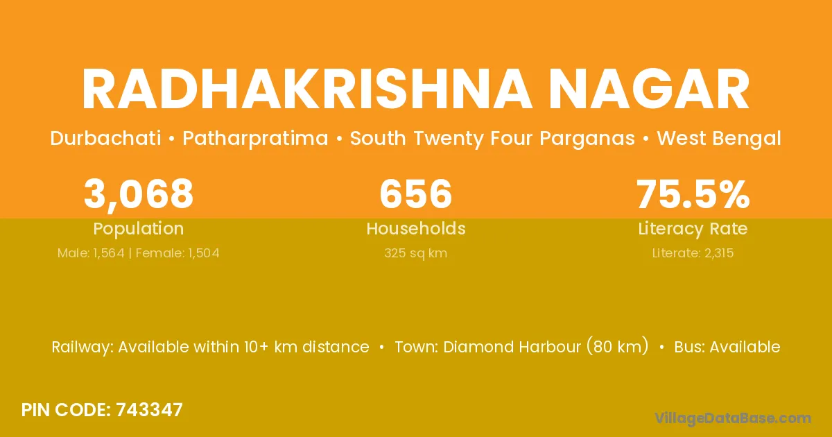 Diamond Harbour (80 km) is the nearest town to Radhakrishna Nagar village for major economic activities and is located approximately 80 km away.