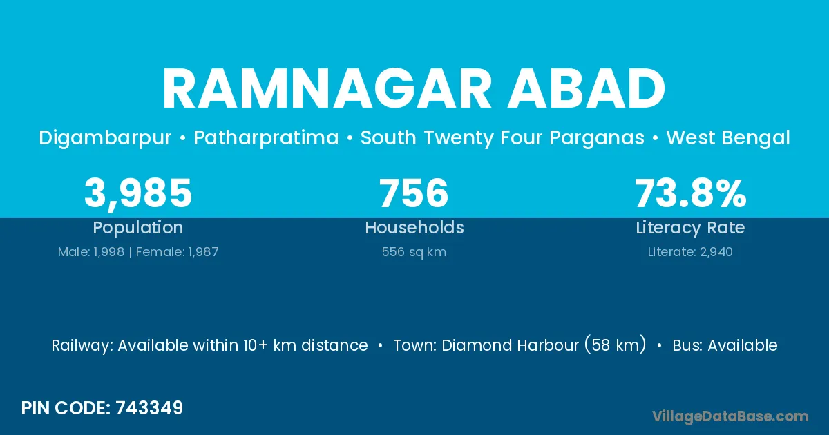 Diamond Harbour (58 km) is the nearest town to Ramnagar Abad village for major economic activities and is located approximately 58 km away.