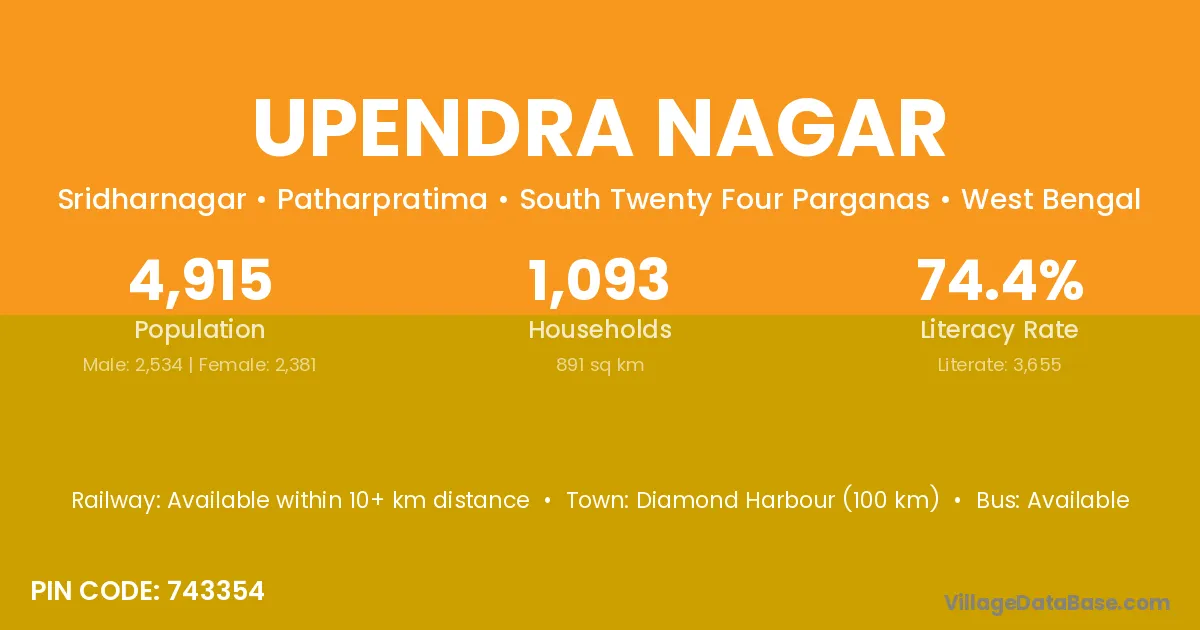 Diamond Harbour (100 km) is the nearest town to Upendra Nagar village for major economic activities and is located approximately 100 km away.
