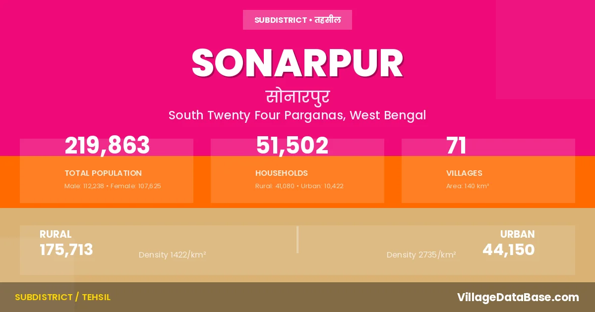 According to the 2011 census The total area of Sonarpur Subdivision is 140 km², with a population of 219863 people. The population density is 1,574 inhabitants per square kilometre, and there are approximately 51502 houses in the sub district.