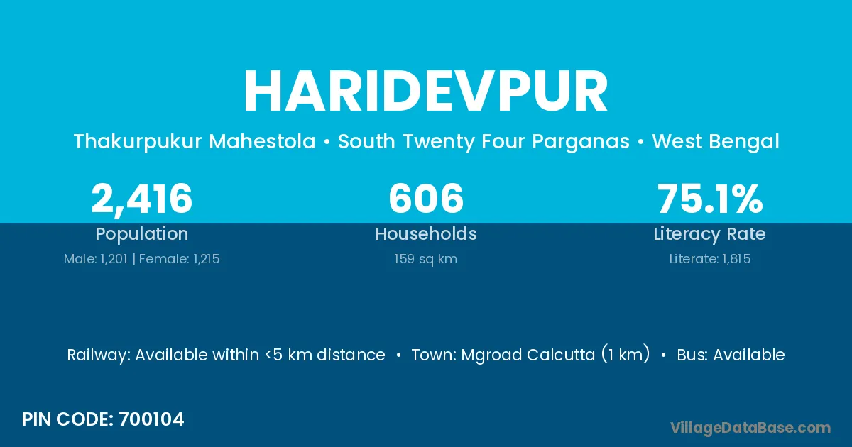 Mgroad Calcutta (1 km) is the nearest town to Haridevpur village for major economic activities and is located approximately 1 km away.