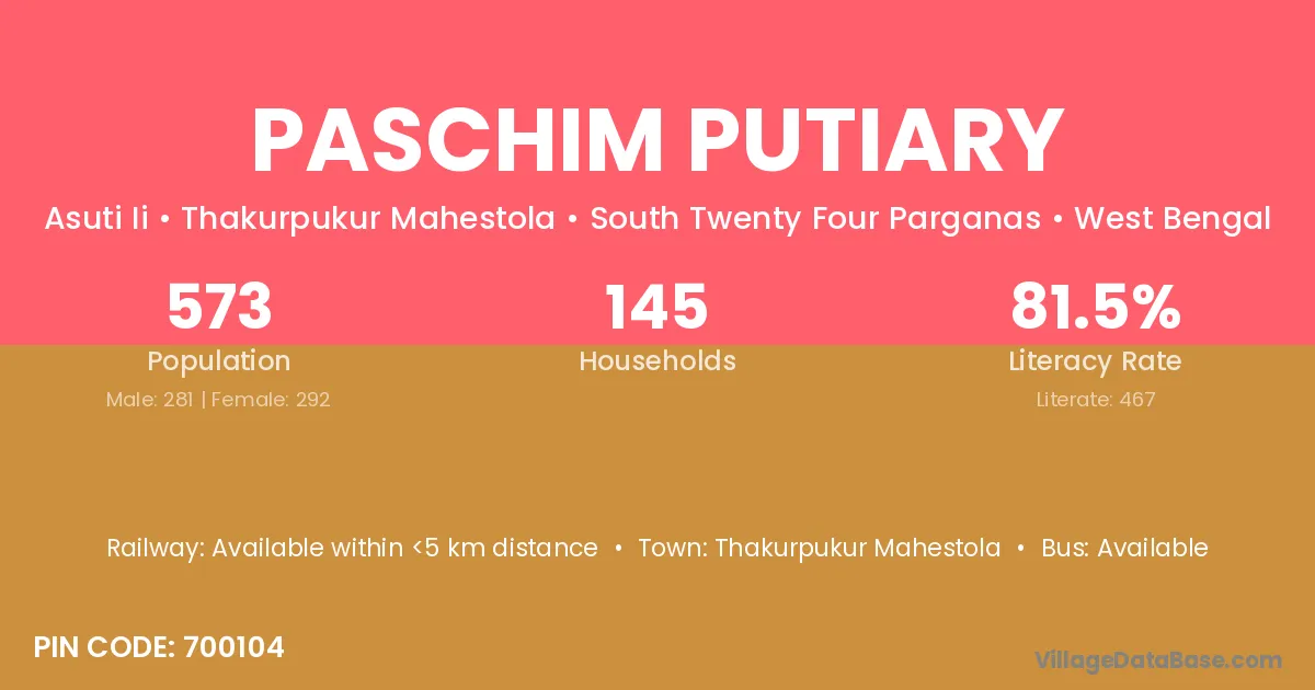 Paschim Putiary village has a total population of 573 people, of which 281 are males and 292 are females.