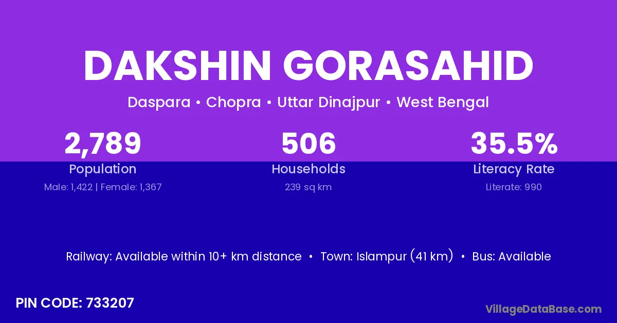 Islampur (41 km) is the nearest town to Dakshin Gorasahid village for major economic activities and is located approximately 41 km away.