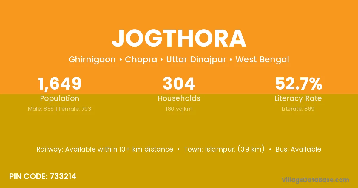 Islampur. (39 km) is the nearest town to Jogthora village for major economic activities and is located approximately 39 km away.