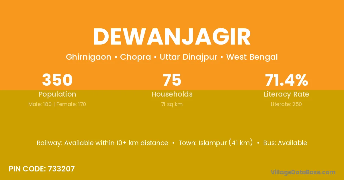 Islampur (41 km) is the nearest town to Dewanjagir village for major economic activities and is located approximately 41 km away.