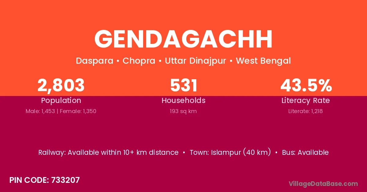 Islampur (40 km) is the nearest town to Gendagachh village for major economic activities and is located approximately 40 km away.