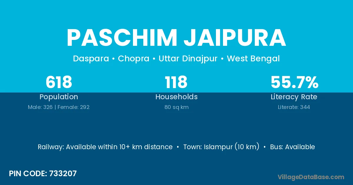 Islampur (10 km) is the nearest town to Paschim Jaipura village for major economic activities and is located approximately 10 km away.