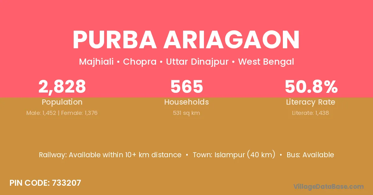 Islampur (40 km) is the nearest town to Purba Ariagaon village for major economic activities and is located approximately 40 km away.