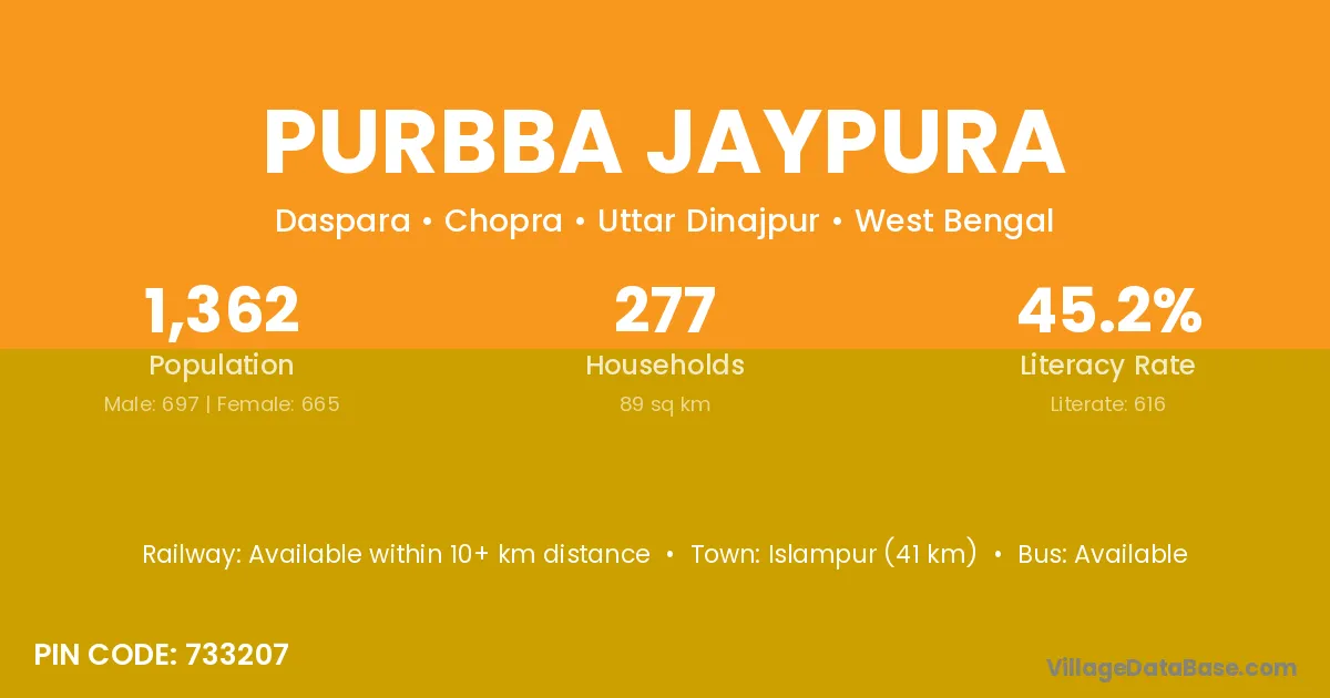 Islampur (41 km) is the nearest town to Purbba Jaypura village for major economic activities and is located approximately 41 km away.