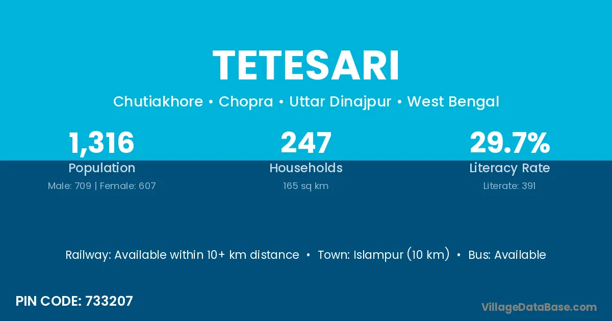 Islampur (10 km) is the nearest town to Tetesari village for major economic activities and is located approximately 10 km away.