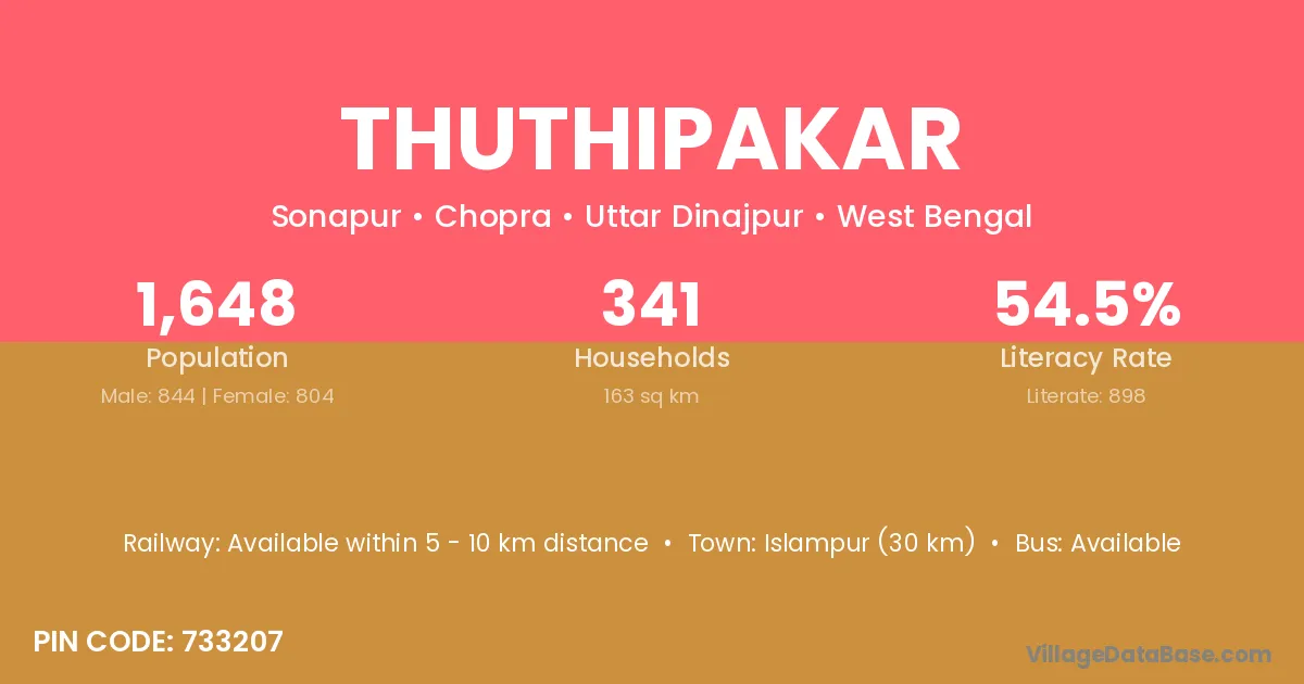 Islampur (30 km) is the nearest town to Thuthipakar village for major economic activities and is located approximately 30 km away.