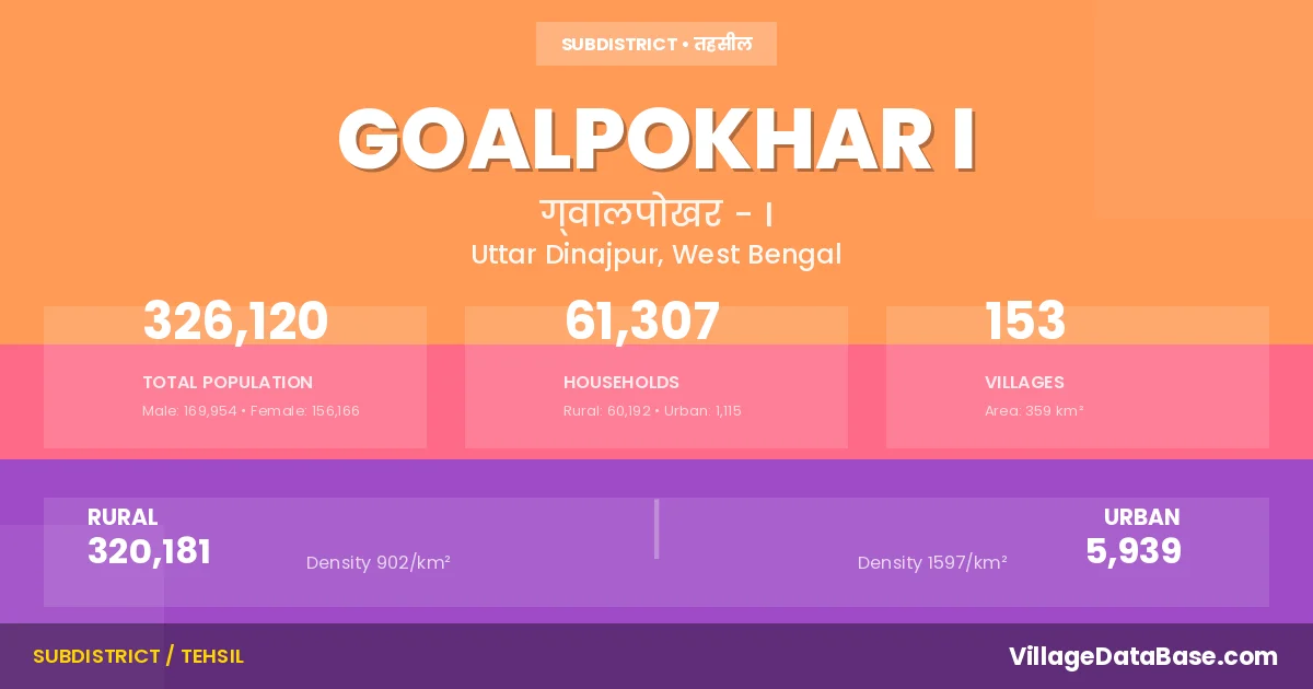 According to the 2011 census The total area of Goalpokhar I Subdivision is 359 km², with a population of 326120 people. The population density is 910 inhabitants per square kilometre, and there are approximately 61307 houses in the sub district.