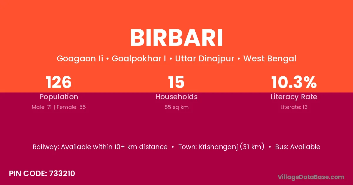 Krishanganj (31 km) is the nearest town to Birbari village for major economic activities and is located approximately 31 km away.