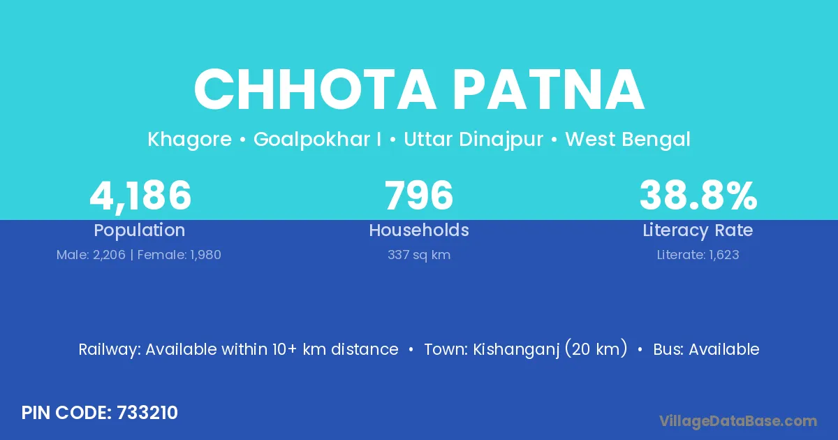 Kishanganj (20 km) is the nearest town to Chhota Patna village for major economic activities and is located approximately 20 km away.