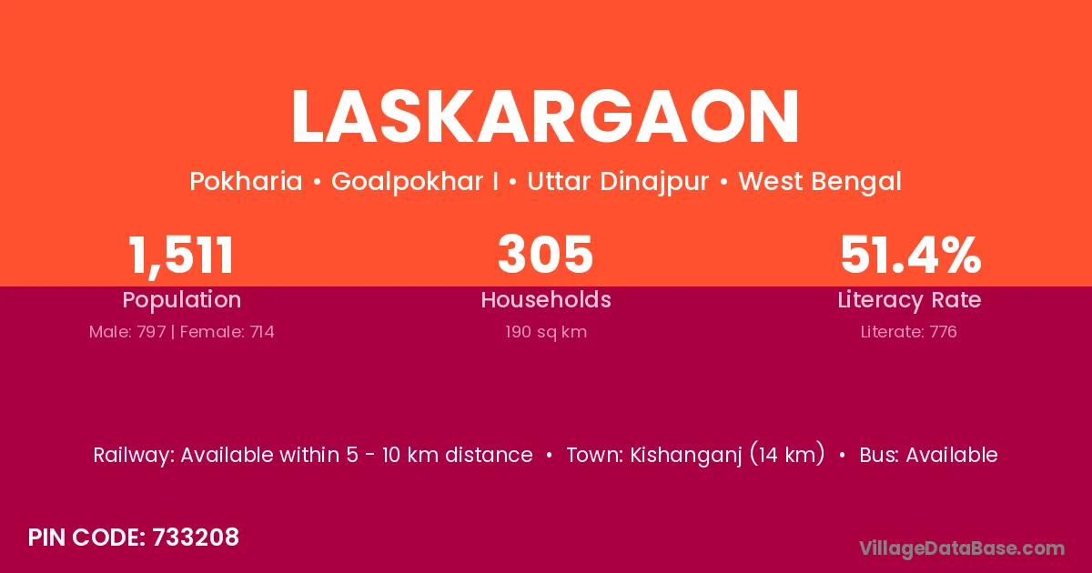 Kishanganj (14 km) is the nearest town to Laskargaon village for major economic activities and is located approximately 14 km away.