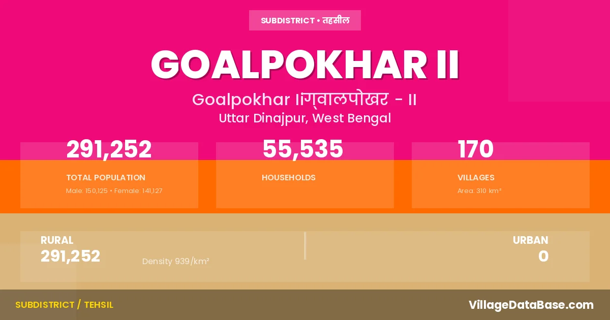 According to the 2011 census The total area of Goalpokhar II Subdivision is 310 km², with a population of 291252 people. The population density is 939 inhabitants per square kilometre, and there are approximately 55535 houses in the sub district.