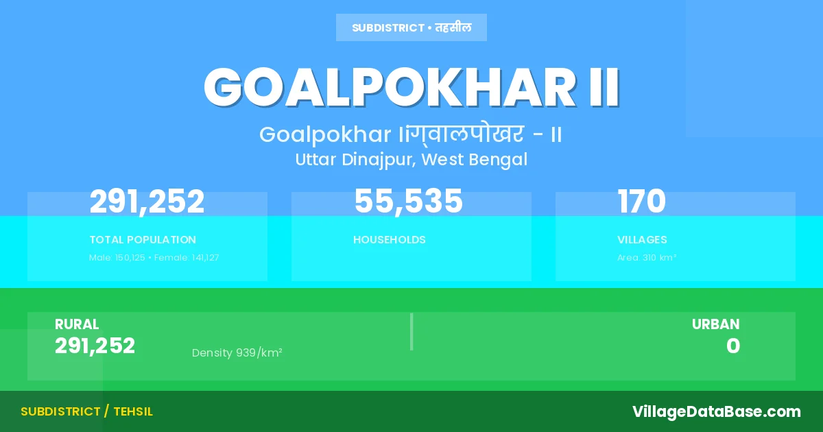 According to the 2011 census The total area of Goalpokhar II Subdivision is 310 km², with a population of 291252 people. The population density is 939 inhabitants per square kilometre, and there are approximately 55535 houses in the sub district.
