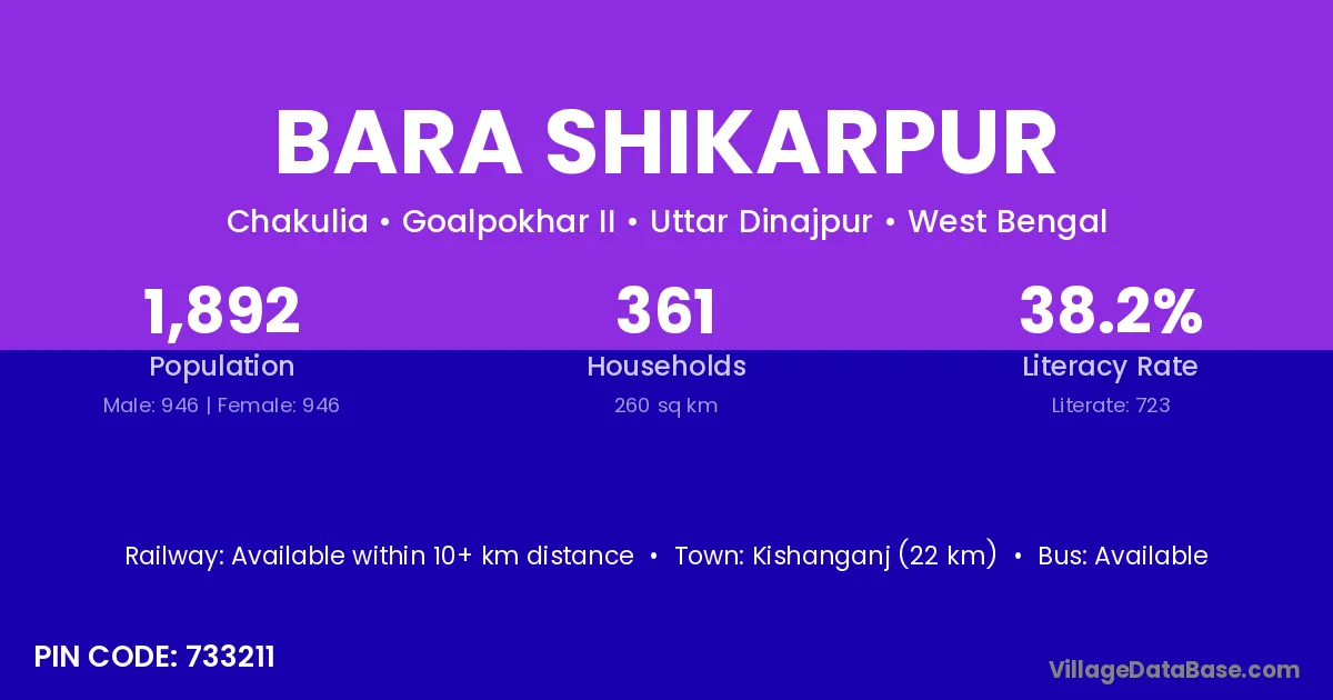 Kishanganj (22 km) is the nearest town to Bara Shikarpur village for major economic activities and is located approximately 22 km away.