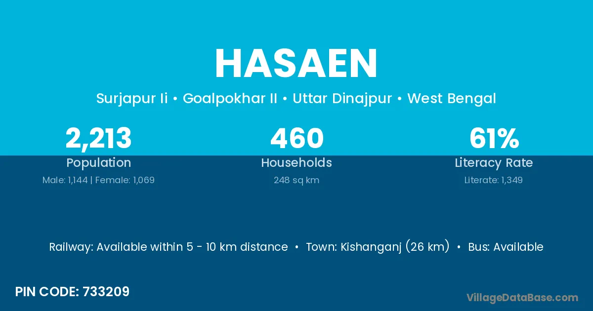 Kishanganj (26 km) is the nearest town to Hasaen village for major economic activities and is located approximately 26 km away.