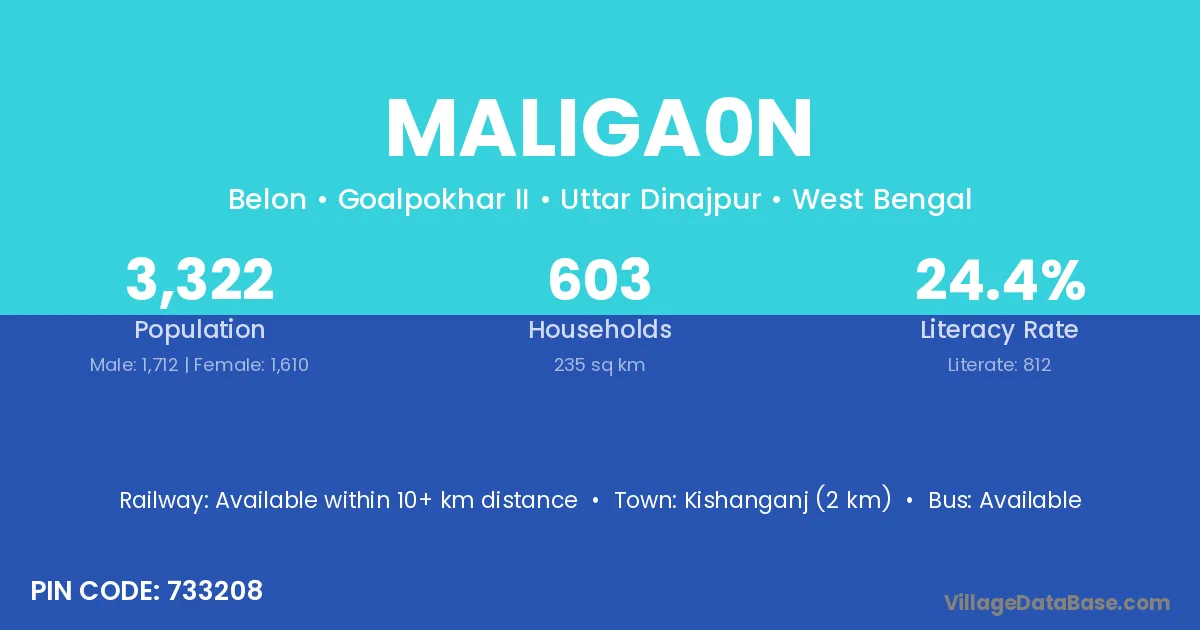 Kishanganj (2 km) is the nearest town to Maliga0n village for major economic activities and is located approximately 2 km away.