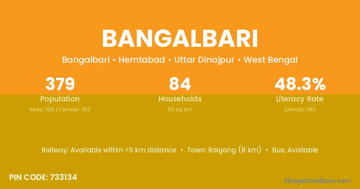Bangalbari village has a total population of 379 people, of which 196 are males and 183 are females.