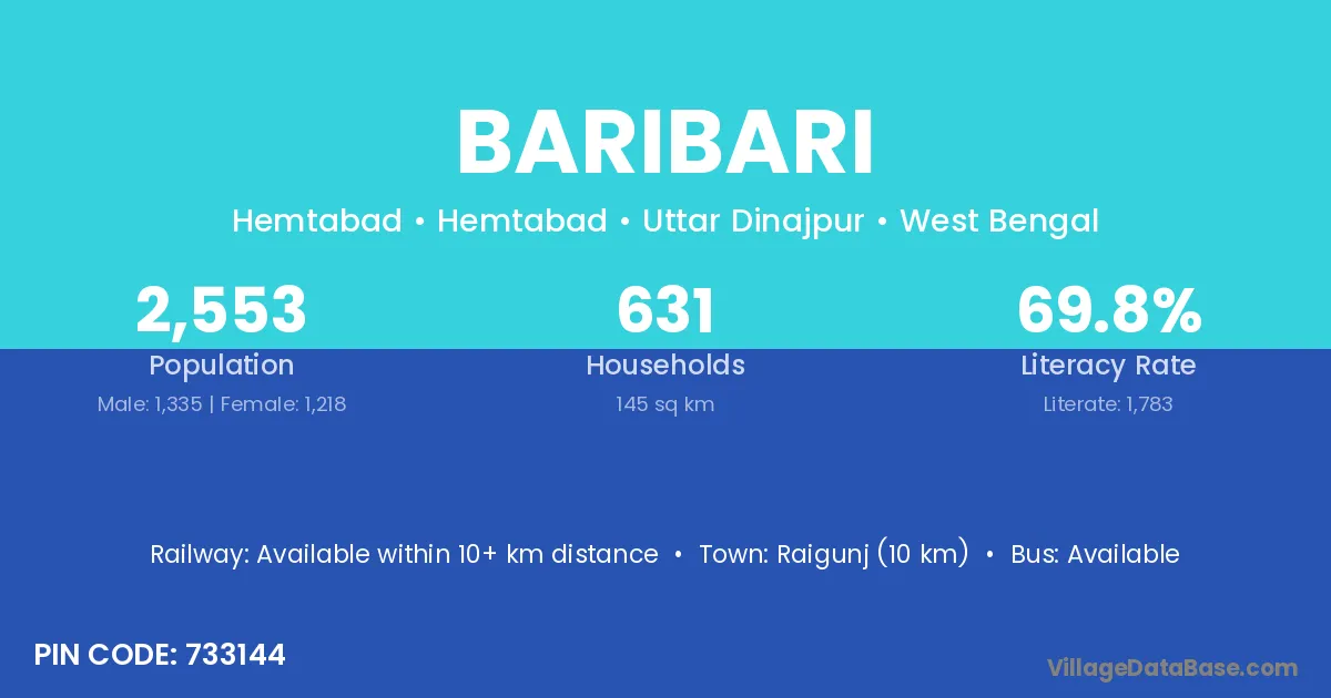 Raigunj (10 km) is the nearest town to Baribari village for major economic activities and is located approximately 10 km away.