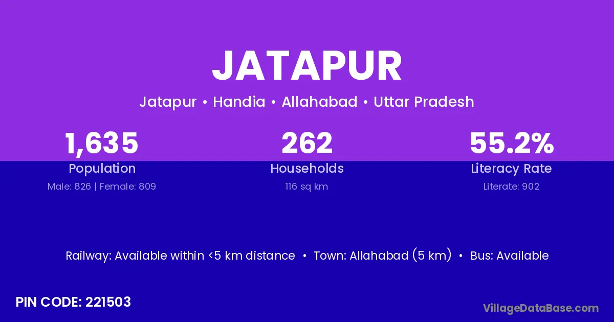 The literacy rate of Jatapur village is 54.82%. Male literacy stands at 60.52% and female literacy at 49.26%.