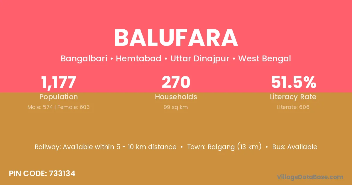 Raigang (13 km) is the nearest town to Balufara village for major economic activities and is located approximately 13 km away.
