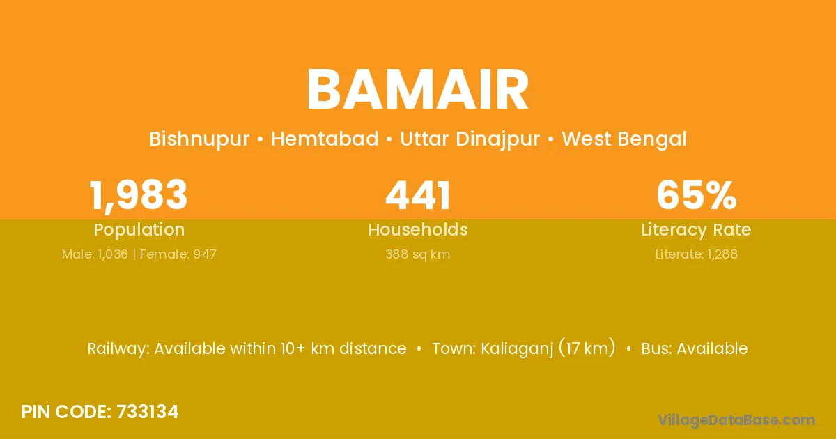Kaliaganj (17 km) is the nearest town to Bamair village for major economic activities and is located approximately 17 km away.