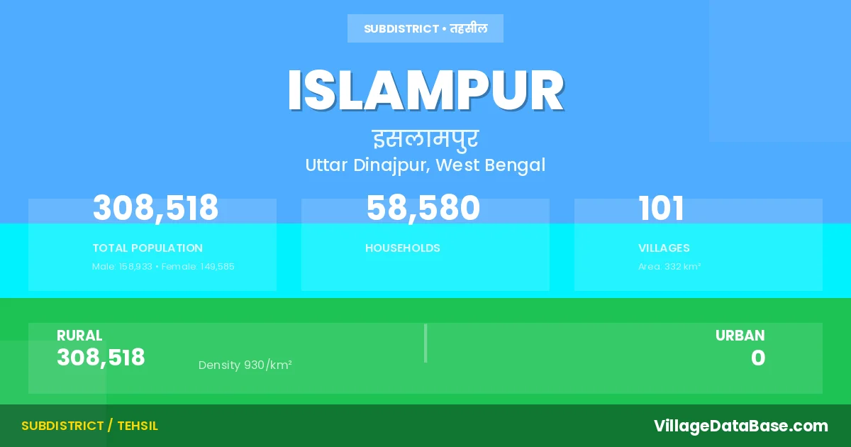 According to the 2011 census The total area of Islampur Subdivision is 332 km², with a population of 308518 people. The population density is 930 inhabitants per square kilometre, and there are approximately 58580 houses in the sub district.