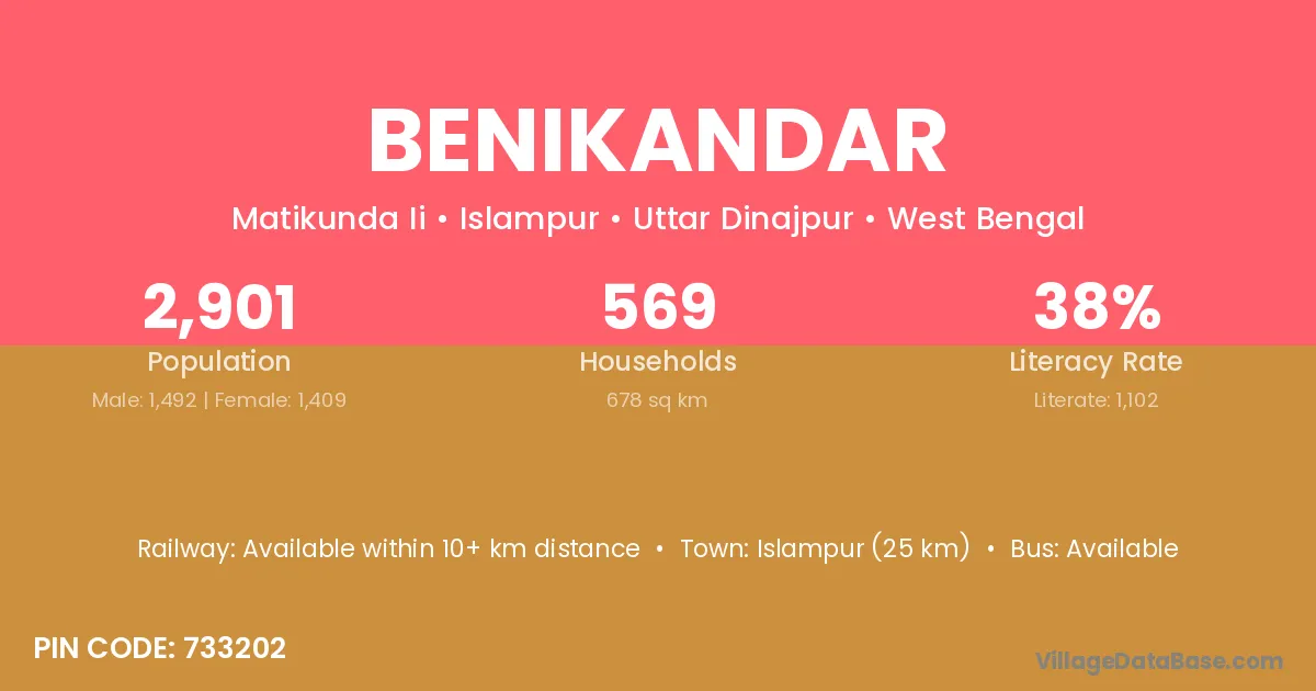 Islampur (25 km) is the nearest town to Benikandar village for major economic activities and is located approximately 25 km away.