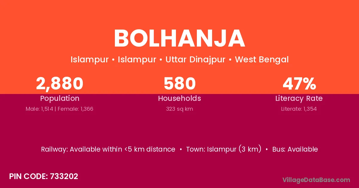 Islampur (3 km) is the nearest town to Bolhanja village for major economic activities and is located approximately 3 km away.